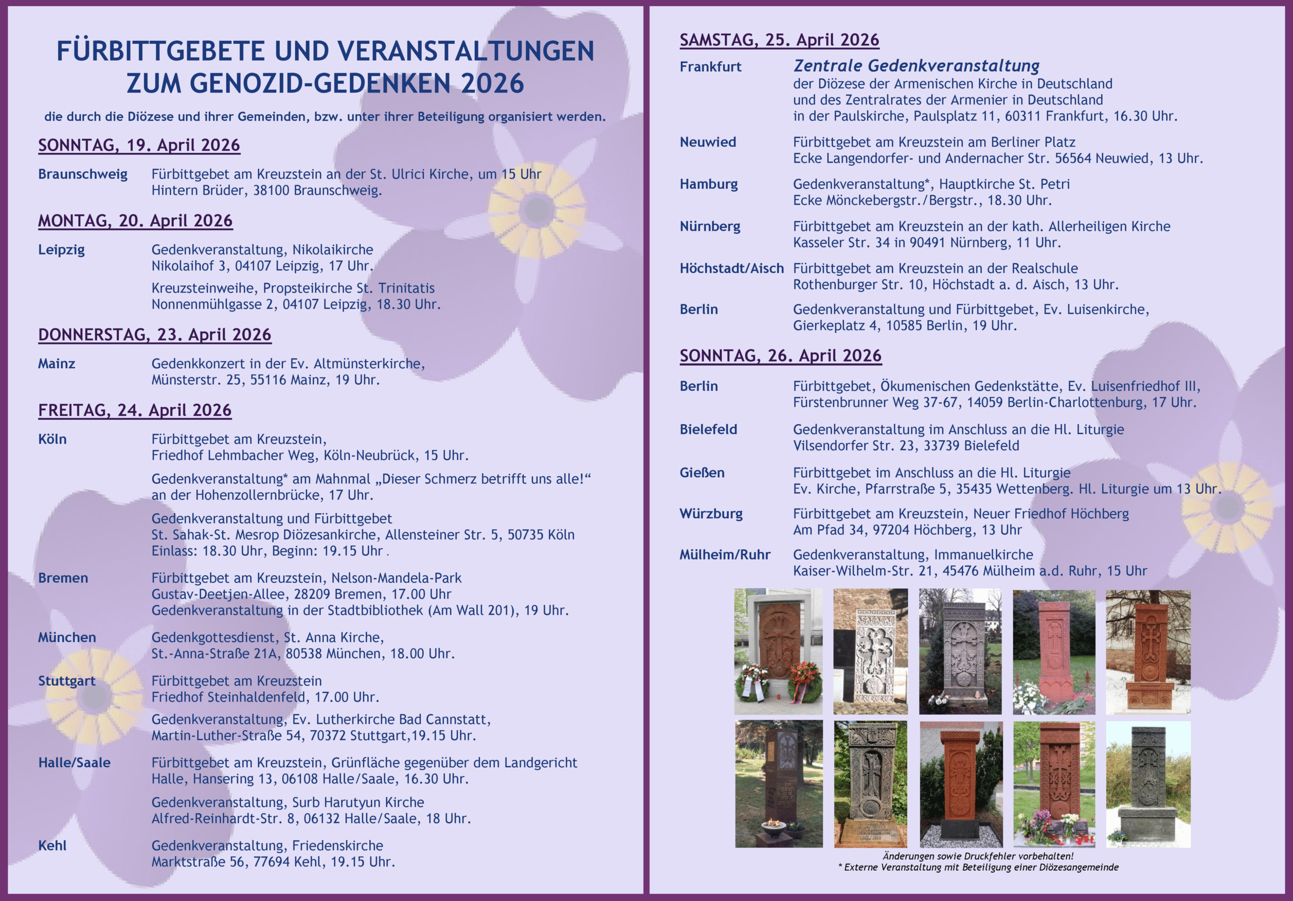 Die Diözese der Armenischen Apostolischen Kirche in Deutschland wurde 1991 mit einem Kondak (Enzyklika) Seiner Heiligkeit Wasken I., Katholikos Aller Armenier, gegründet. 16 Kirchengemeinden in der Bundesrepublik Deutschland sind Teil unserer großen Familie. Sie stehen im Dienst für Menschen im Namen Jesu Christi.